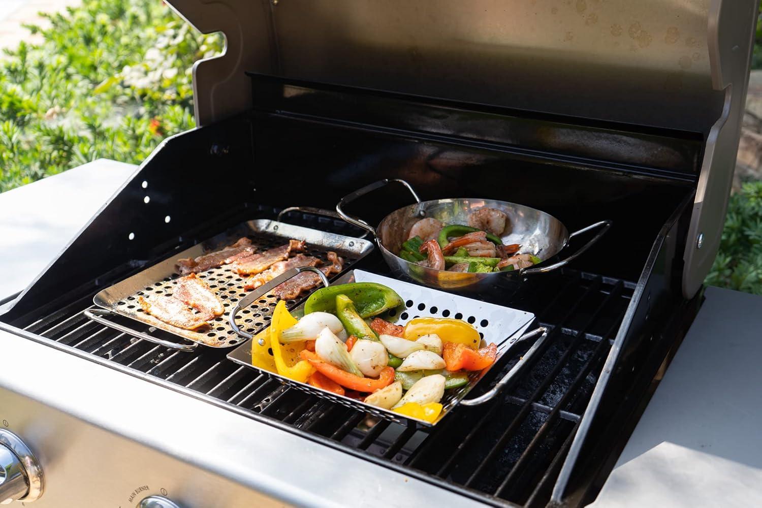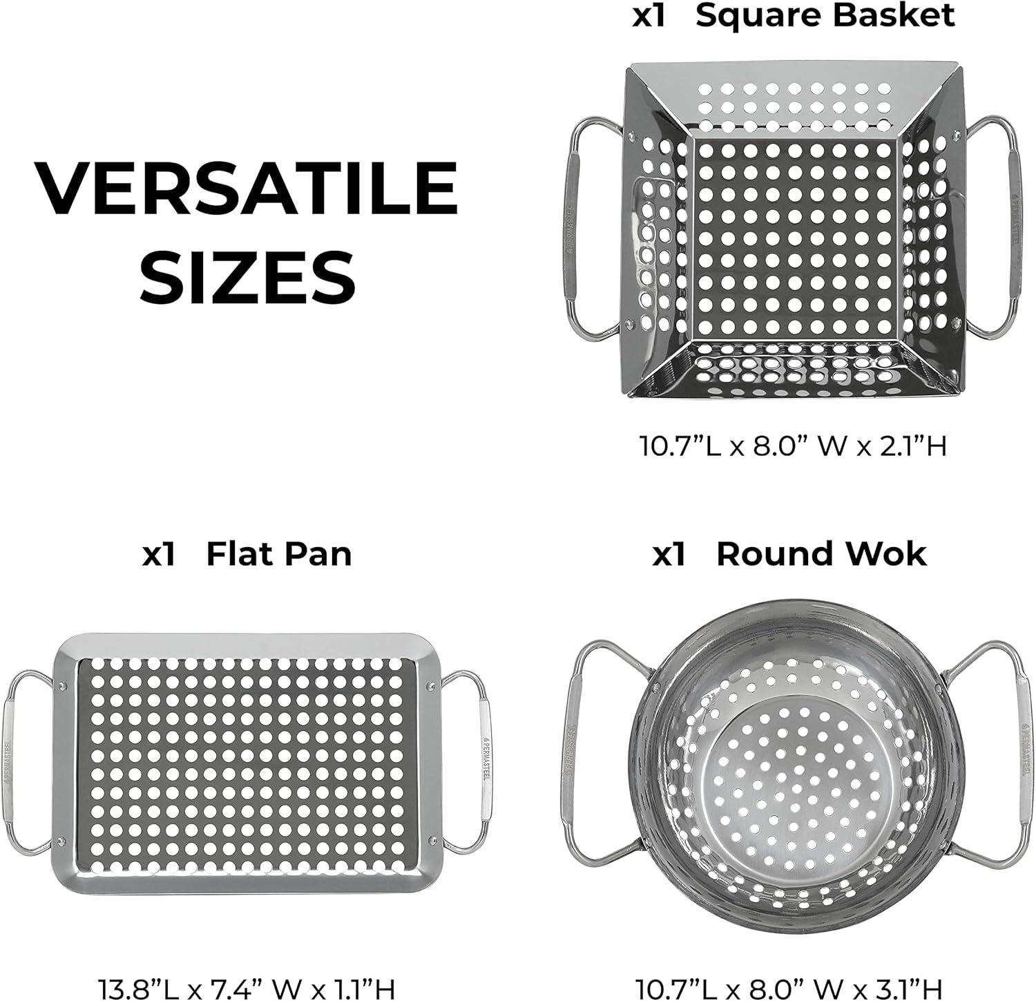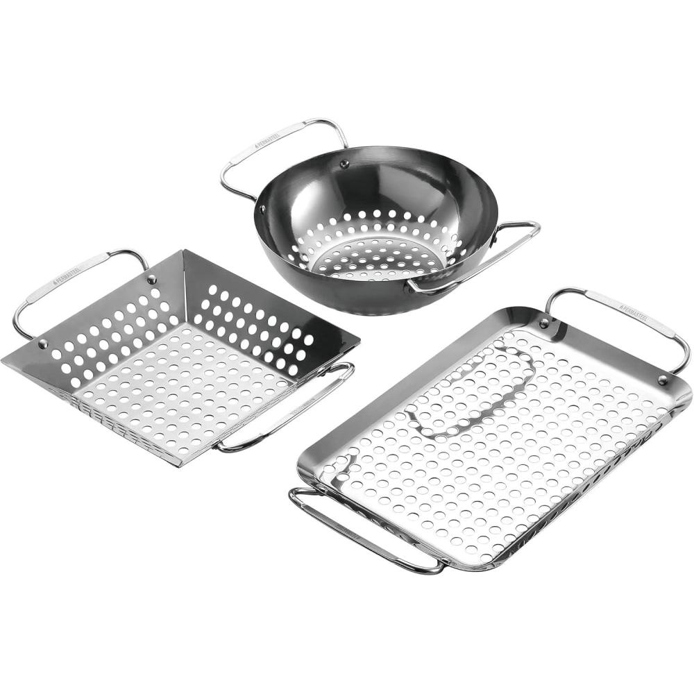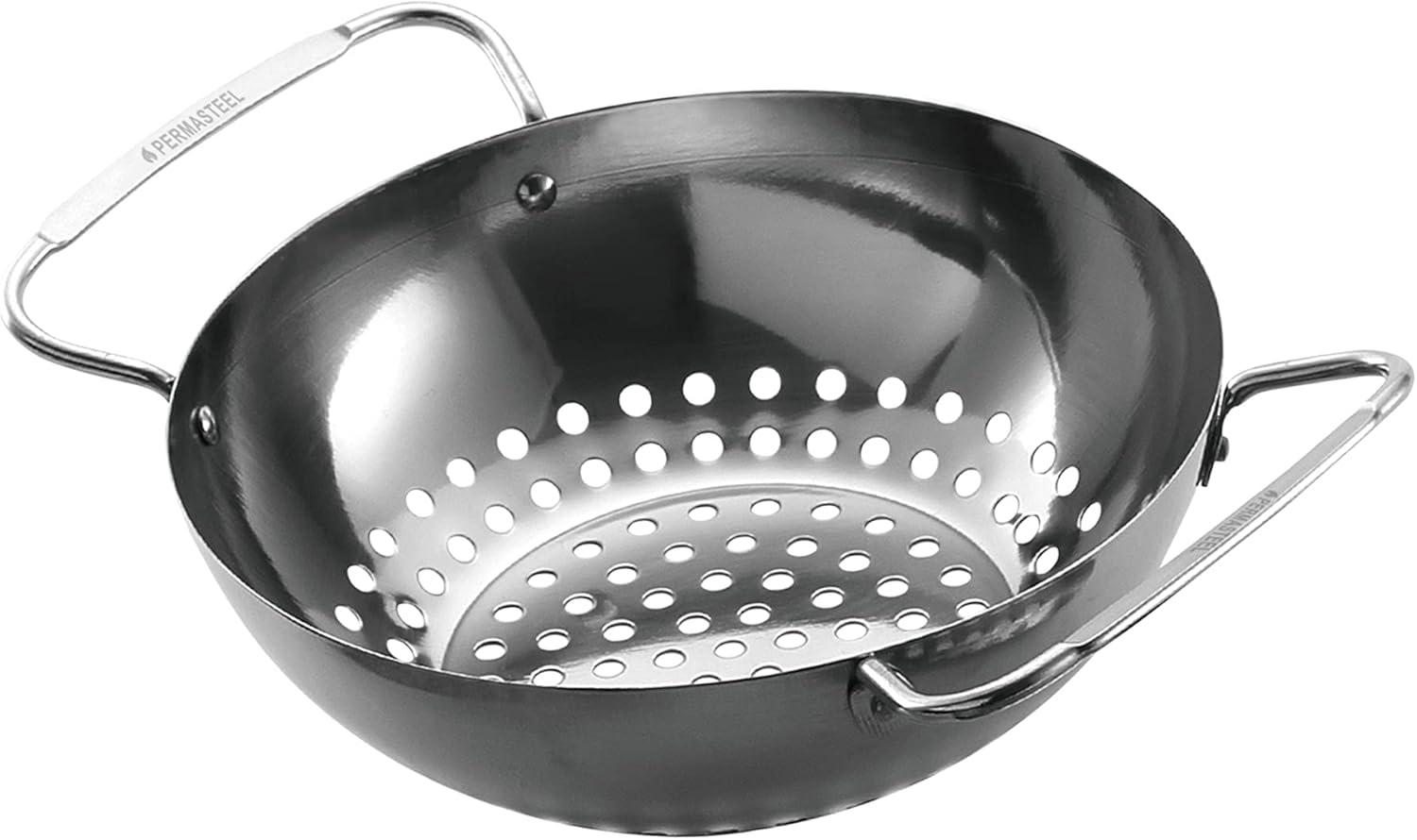 Each of the perforated grill pan, bowl/wok, and basket can be cooked on top of a charcoal grill, propane gas grill, or even wood-burning pellet grill. The perforated holes let the heat and smoke penetrate for even cooking and enhanced flavor. Also makes a great cookware set for portable and outdoor grilling—whether you are camping or glamping, celebrating dinner at the beach, plus more.