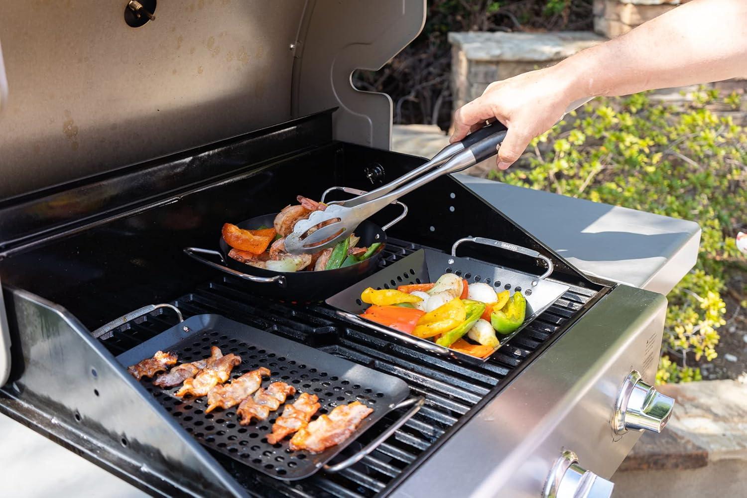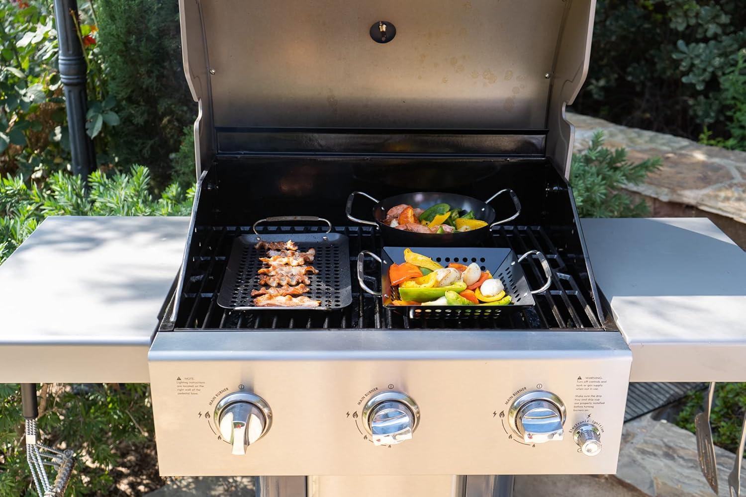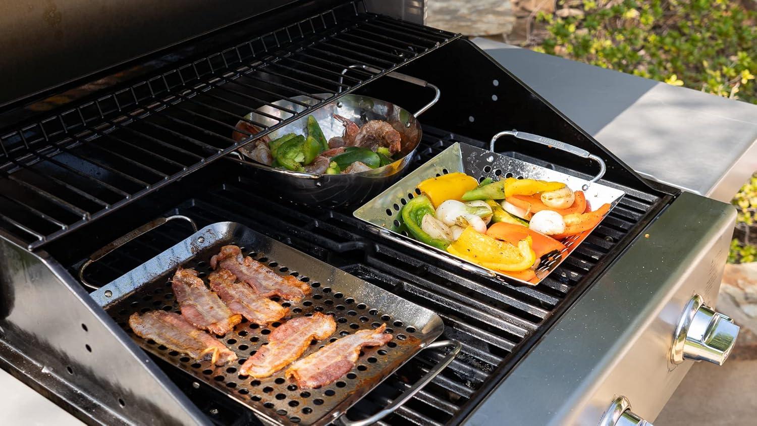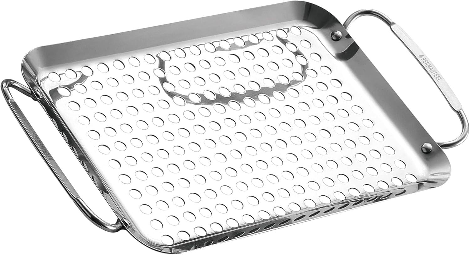 Each of the perforated grill pan, bowl/wok, and basket can be cooked on top of a charcoal grill, propane gas grill, or even wood-burning pellet grill. The perforated holes let the heat and smoke penetrate for even cooking and enhanced flavor. Also makes a great cookware set for portable and outdoor grilling—whether you are camping or glamping, celebrating dinner at the beach, plus more.