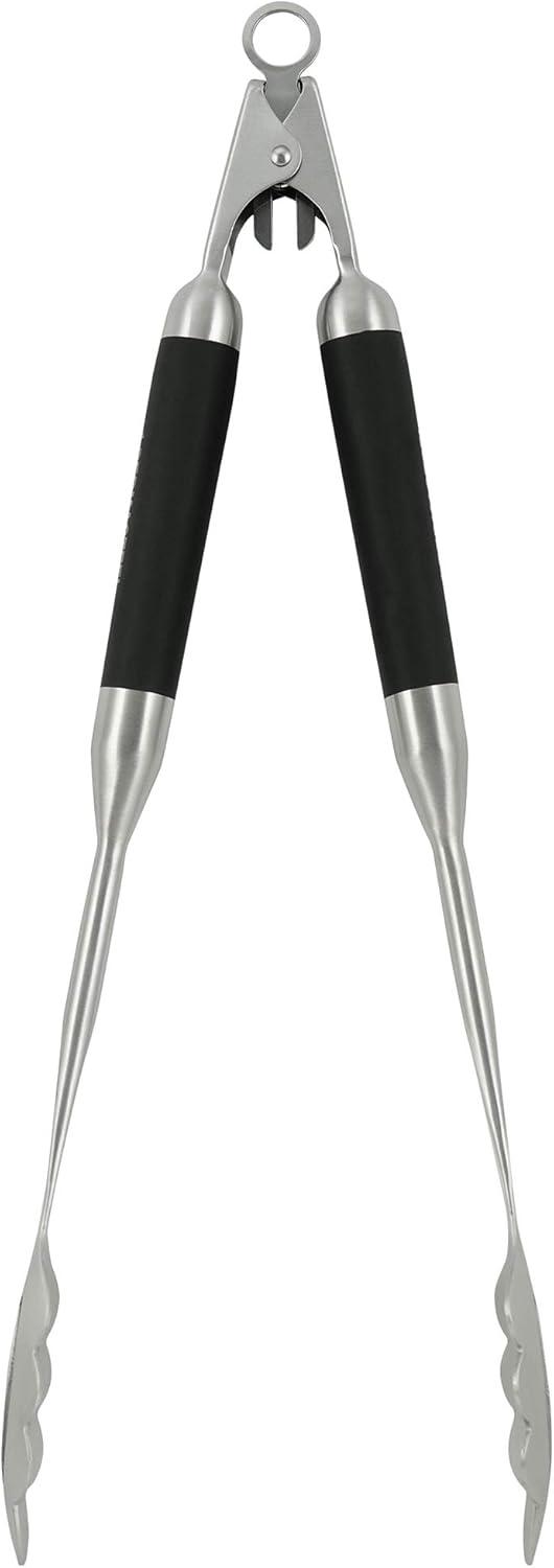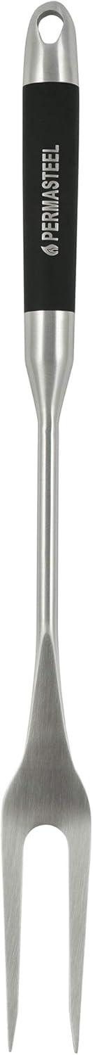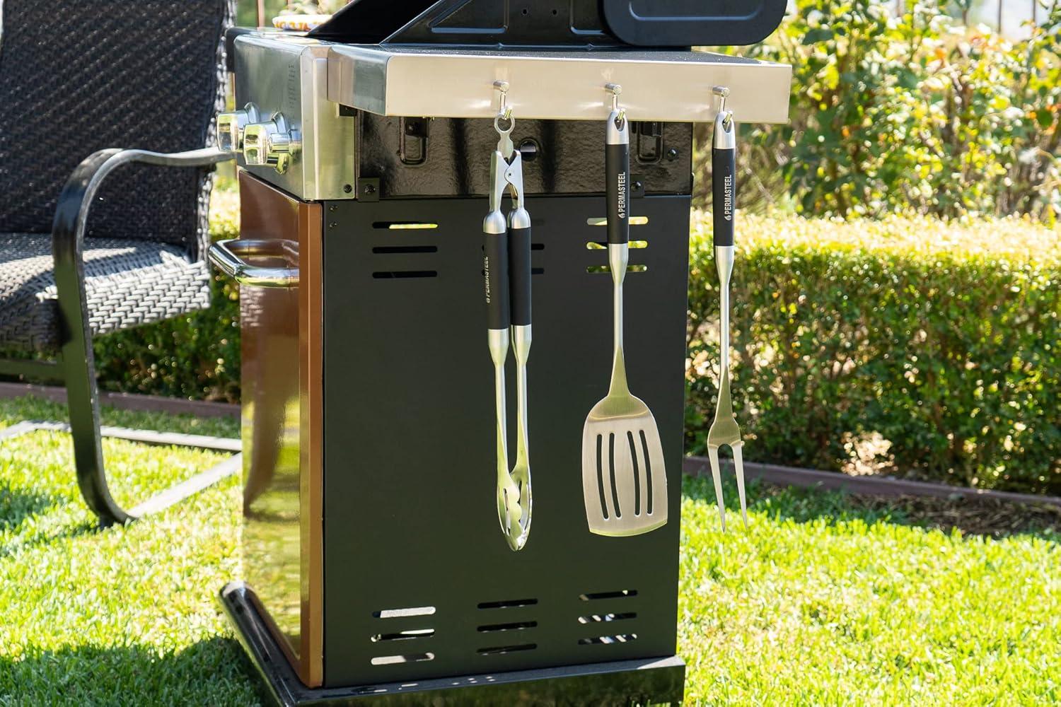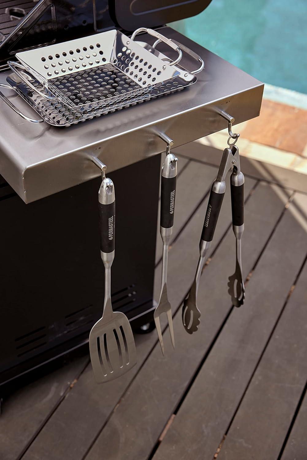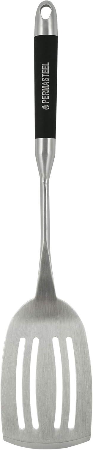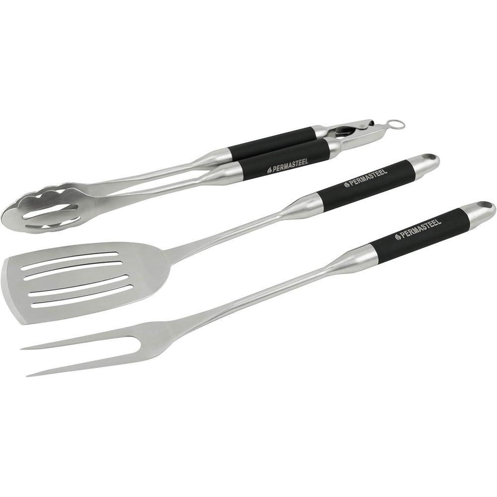 Fire up the grill and get cooking with the Permasteel Grill Tool Set. This 3-piece grill accessory set includes a spatula, fork, and tongs to provide everything you need for indoor and outdoor cooking. The smooth-tip slotted spatula makes it easy to flip and re-arrange food on the grill, the ergonomically-designed fork lets you pick up food without shredding, and the tongs close and lock into place for compact storage when not in use. The sure-grip TPR handles offer additional comfort while using the utensils, and each tool handle includes an integrated opening so you can hang them on your grill for quick and convenient access. The heavy duty, solid stainless steel construction is designed for long-lasting durability, and these easy-care metal grill tools are dishwasher safe for quick clean up when you're done cooking.