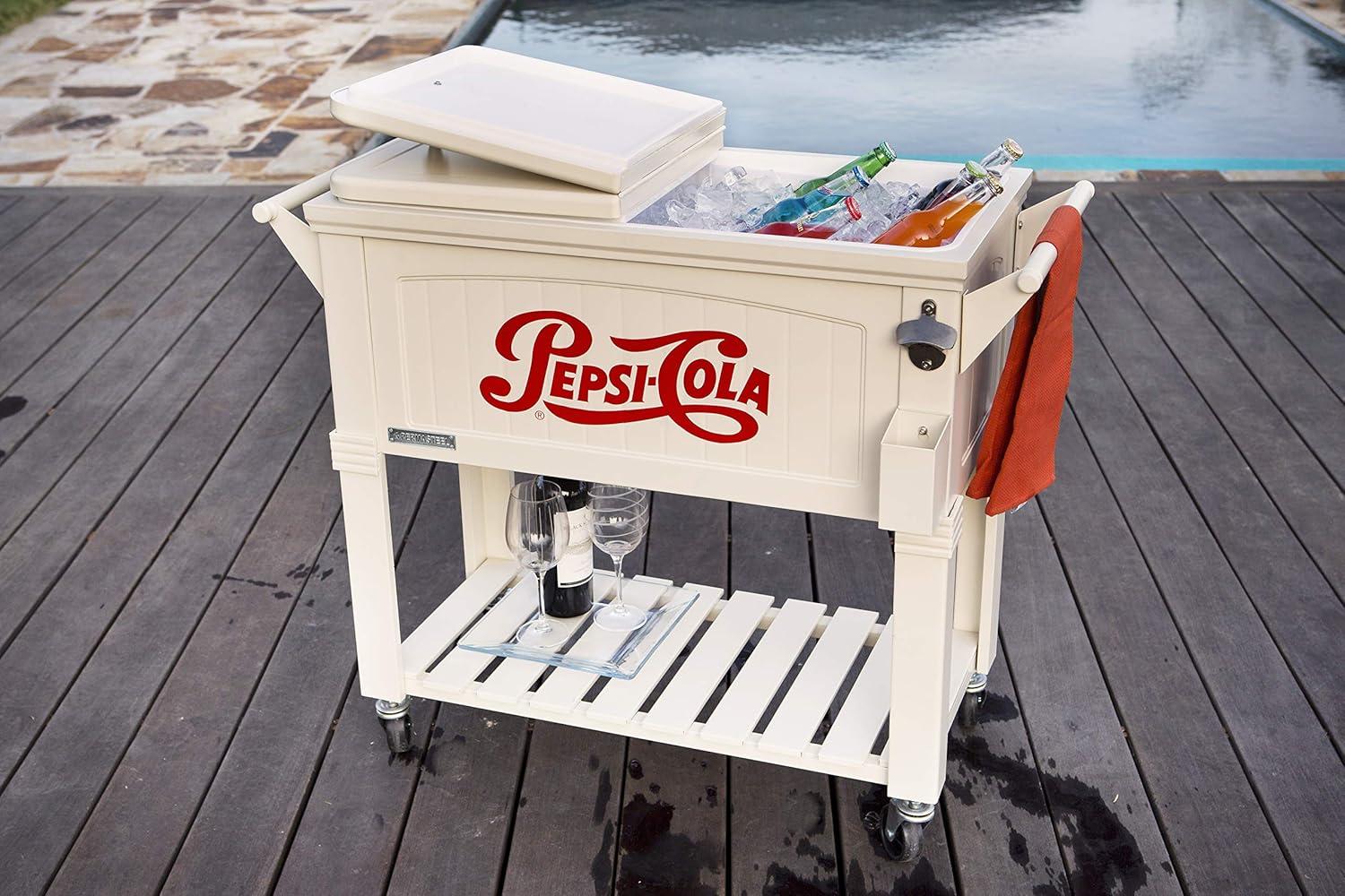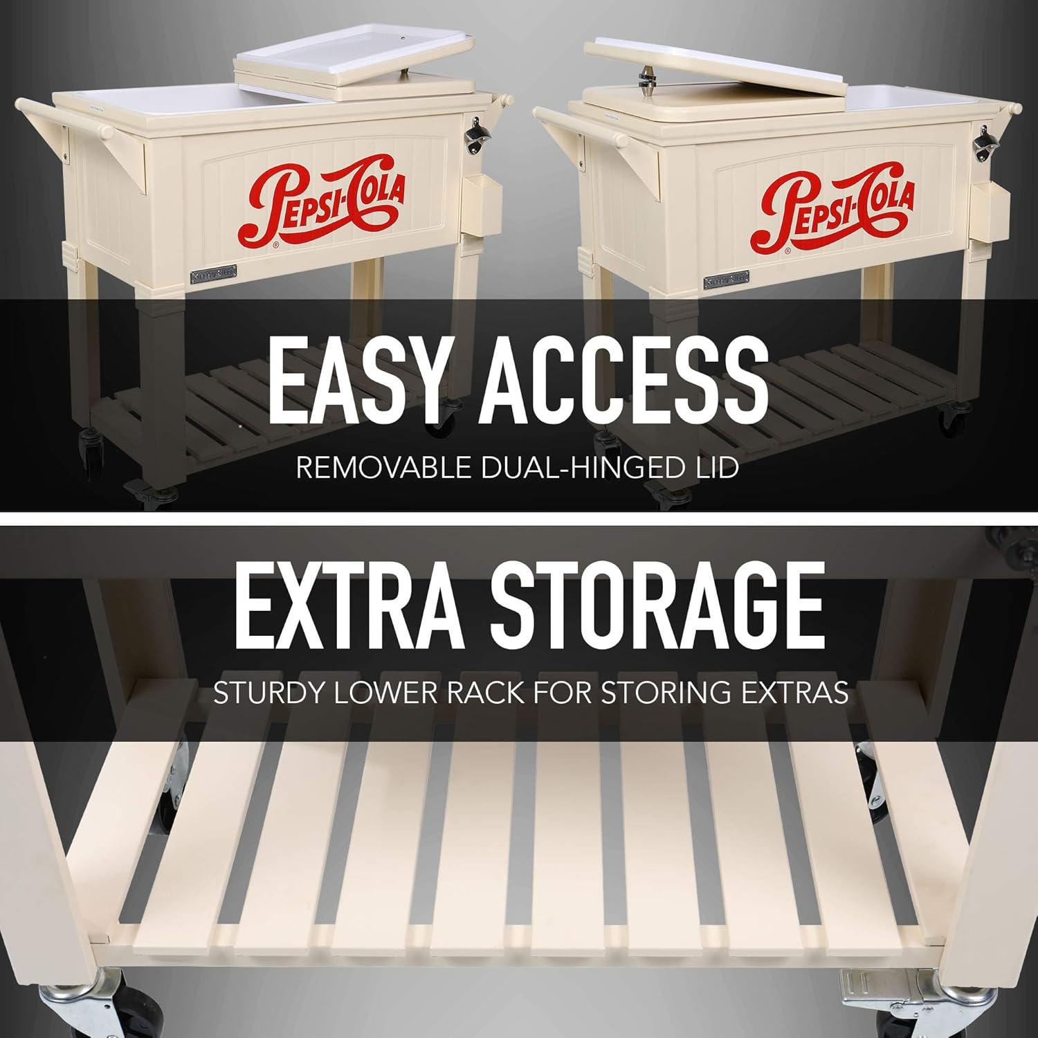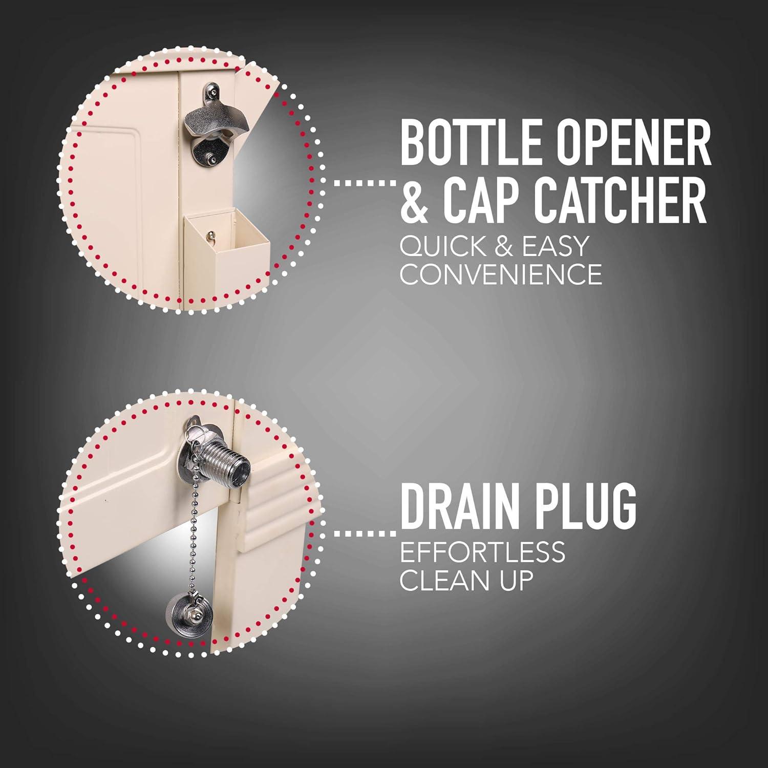 This 80 quart outdoor antique patio furniture style cooler cart will add elegance to any backyard & outdoor patio. Entertain your guests with this beautiful powder coated steel rolling patio cooler cart with its insulated basin that keeps your beverages cold for multiple hours with its injected molded insulation technology. It holdsup to 110 – 12oz cans with plenty of room for ice. Featuring a powder coated finish for long life & split double lid for easy access to cold drinks. Once you have your preferred drink, you can easily remove the cap with the convenient bottle opener & cap catcher. This patio cooler includes four heavy-duty casters for easy mobility, Two locking for stability once in the desired area. Easily roll this patio cooler to any desired location wherever the party Goes. After use, simply pull the plug & drain. The convenient lower rack/shelf provides extra space for extra beverages or other items you wish to store. Feel confident in this Permasteel patio cooler as a solution for all of your patio cooler needs.