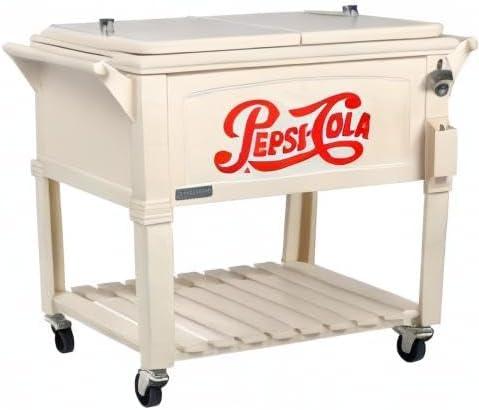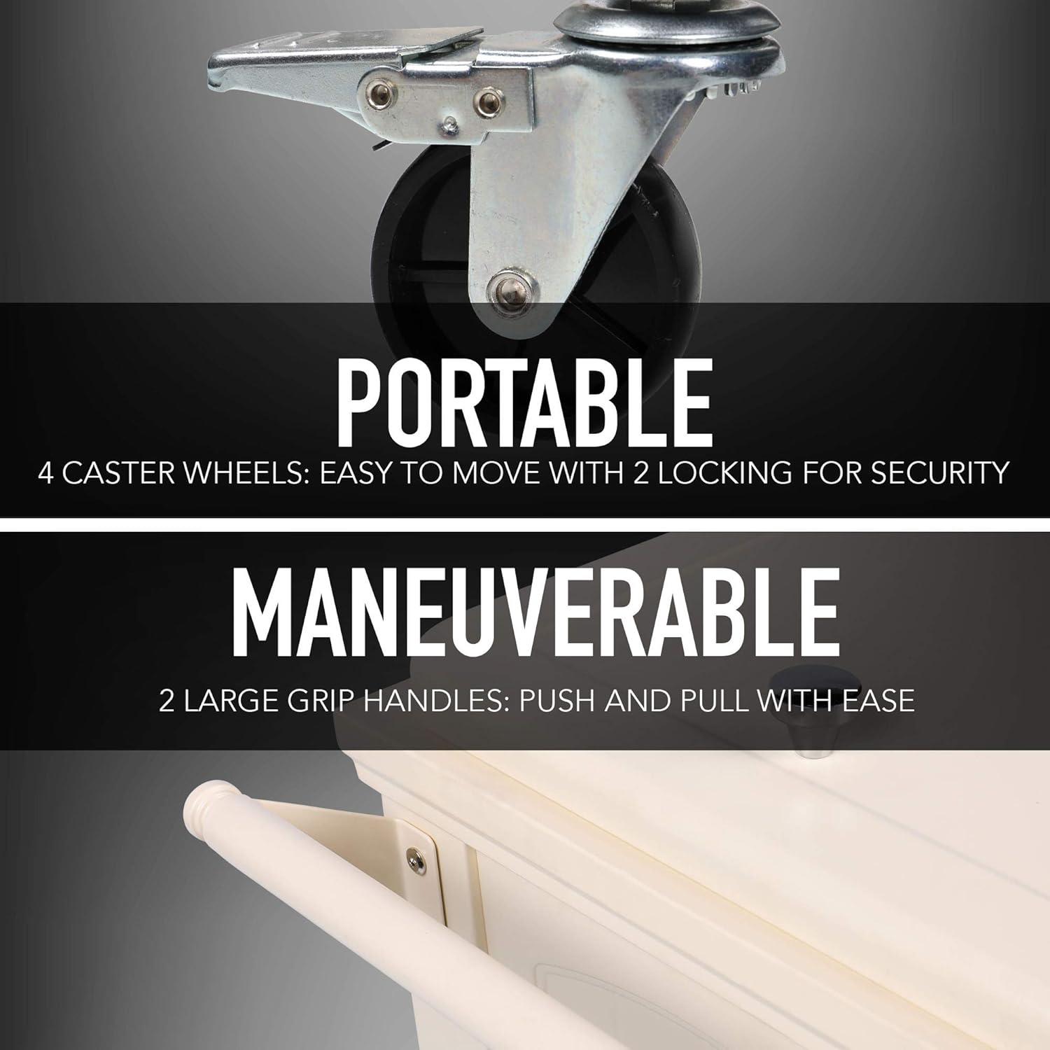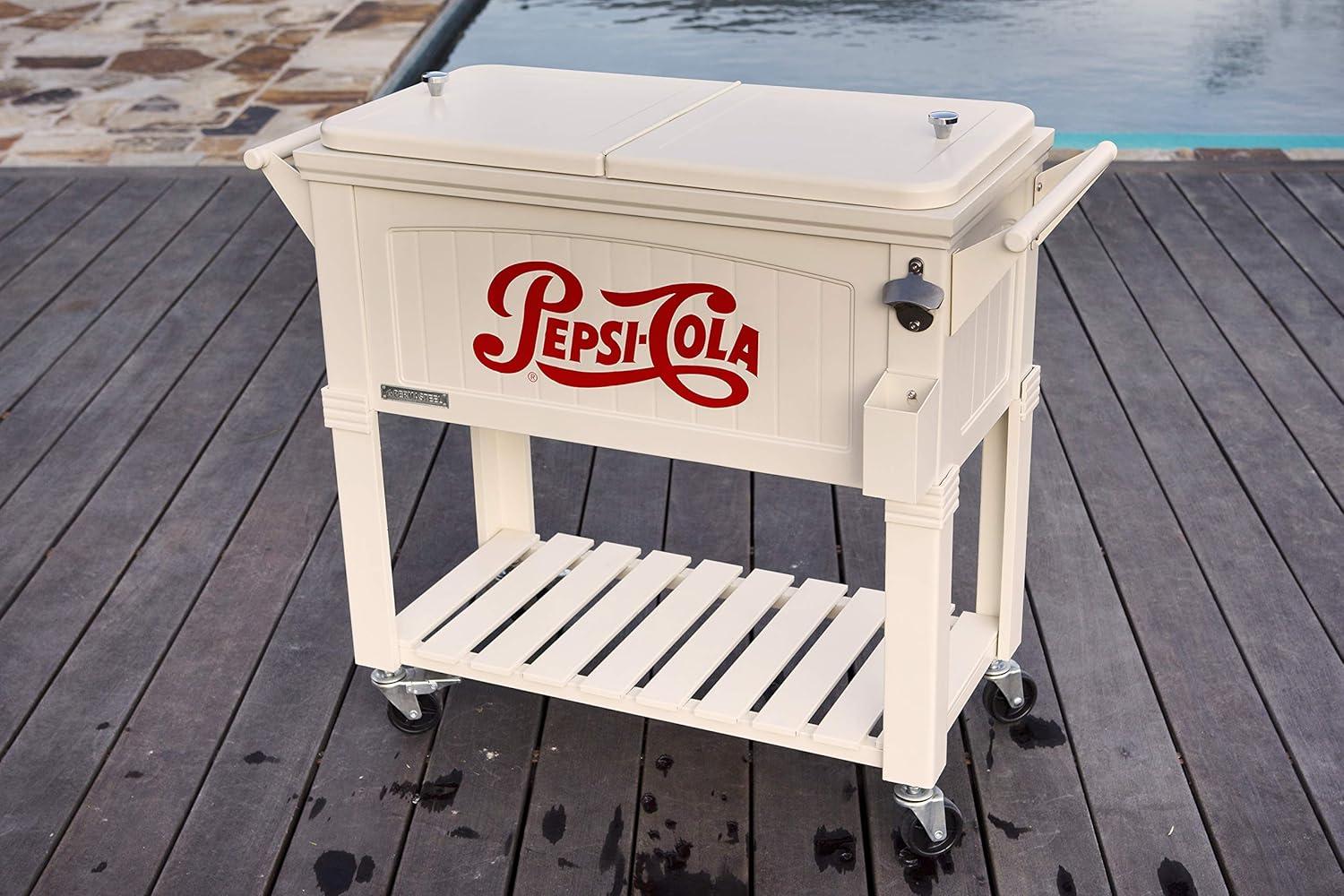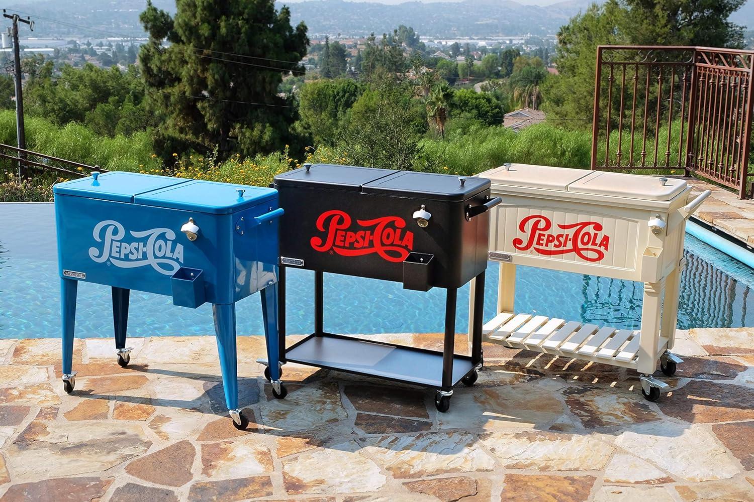 This 80 quart outdoor antique patio furniture style cooler cart will add elegance to any backyard & outdoor patio. Entertain your guests with this beautiful powder coated steel rolling patio cooler cart with its insulated basin that keeps your beverages cold for multiple hours with its injected molded insulation technology. It holdsup to 110 – 12oz cans with plenty of room for ice. Featuring a powder coated finish for long life & split double lid for easy access to cold drinks. Once you have your preferred drink, you can easily remove the cap with the convenient bottle opener & cap catcher. This patio cooler includes four heavy-duty casters for easy mobility, Two locking for stability once in the desired area. Easily roll this patio cooler to any desired location wherever the party Goes. After use, simply pull the plug & drain. The convenient lower rack/shelf provides extra space for extra beverages or other items you wish to store. Feel confident in this Permasteel patio cooler as a solution for all of your patio cooler needs.